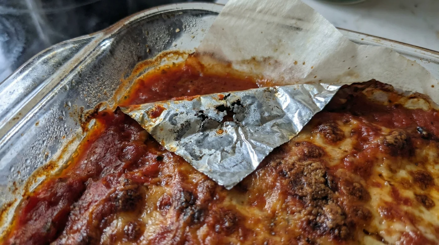 The acid acts as a relentless solvent. It begins to dissolve the structural matrix of the foil, pulling microscopic metal ions directly into your food. You might have previously noticed a harsh, slightly metallic tang on the top layer of your lasagna and simply blamed the brand of crushed tomatoes. Or perhaps you have peeled back the foil from a leftover portion the next day, only to find tiny, brittle pinholes in the metal and strange gray specks resting on your melted mozzarella. That is not a cooking error; that is a chemical migration.